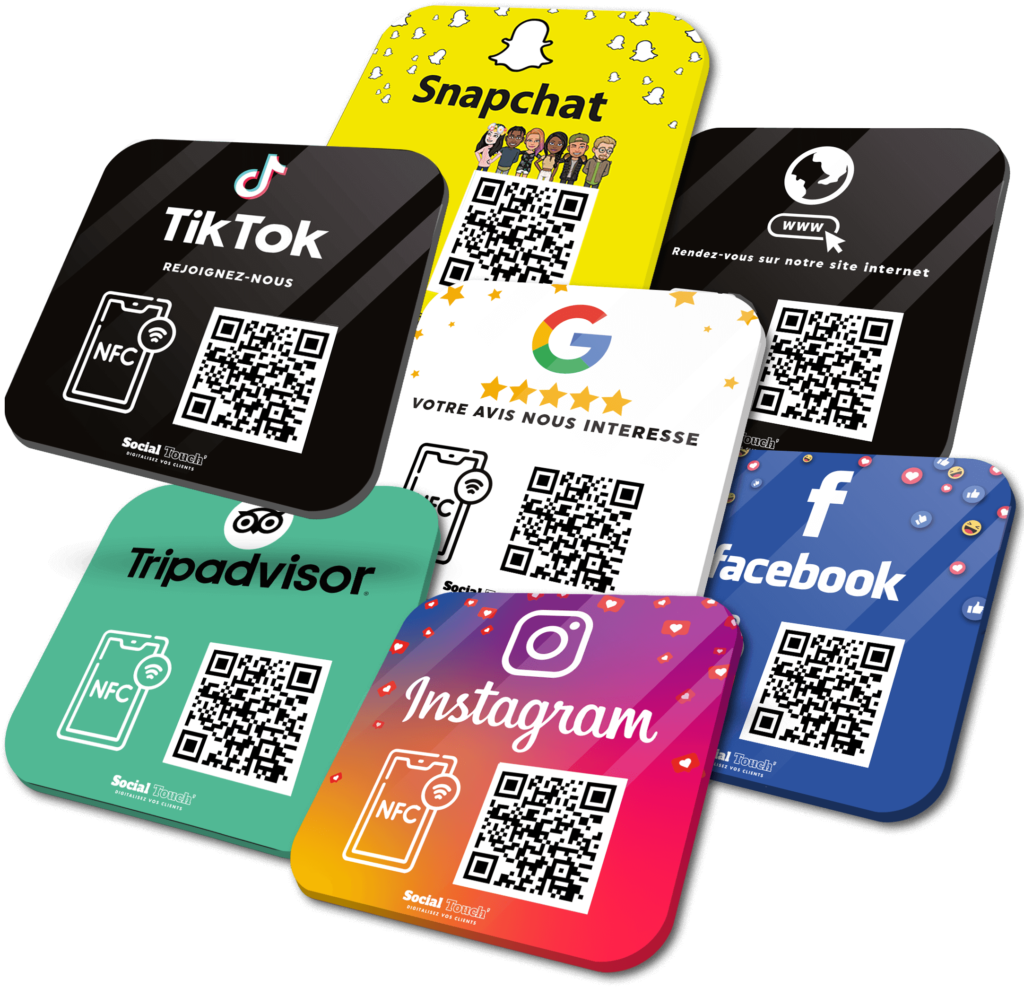 Thanks to our innovative system of connected NFC plates and personalized QR Codes, customers can quickly and easily scan the plate with their smartphone and be redirected directly to the merchant’s Google Avis, Instagram, Facebook, TripAdvisor, SnapChat or TikTok page. Our NFC & QR Code Social Touch’ connected tags enable customers to subscribe, like or leave a review in seconds, without having to search for the Google Avis page or the merchant’s account.