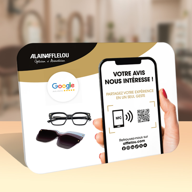 Manufactured in 17 x 12 cm Plexiglas, 4 mm thick, this sign is designed to be mounted on a counter, kiosk or display case. It combines maximum visibility, NFC + QR code technology, and 100% customized design.