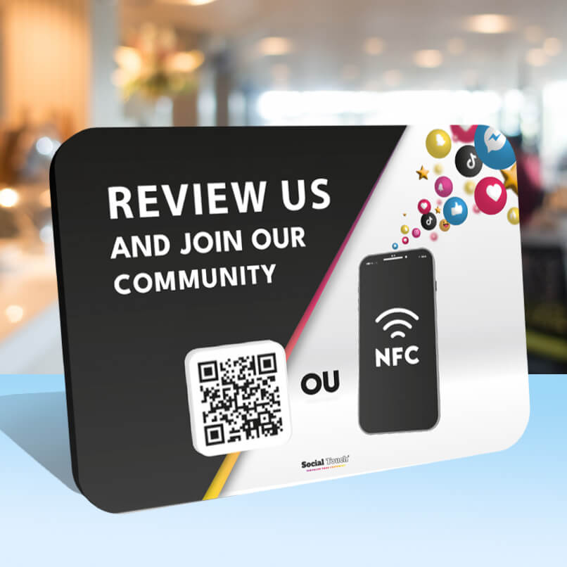 Manufactured in 17 x 12 cm Plexiglas, 4 mm thick, this sign is designed to be mounted on a counter, kiosk or display case. It combines maximum visibility, NFC + QR code technology, and 100% customized design.