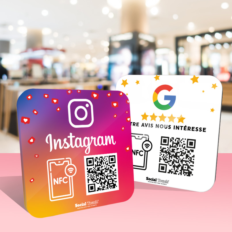 Le Pack Duo de SocialTouch vous permet d’équiper votre commerce de deux plaques NFC connectées complémentaires :